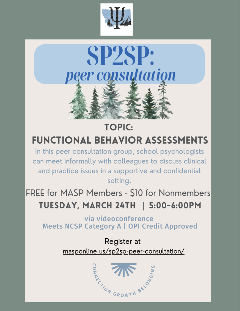 Join us for our next SP2SP online session focusing on the topic of Functional Behavior Assessments! This is the rescheduled event from December that will now be held on Tuesday, March 24th from 5-6pm. SP2SP events are FREE for MASP Members and only $10 for non-members.