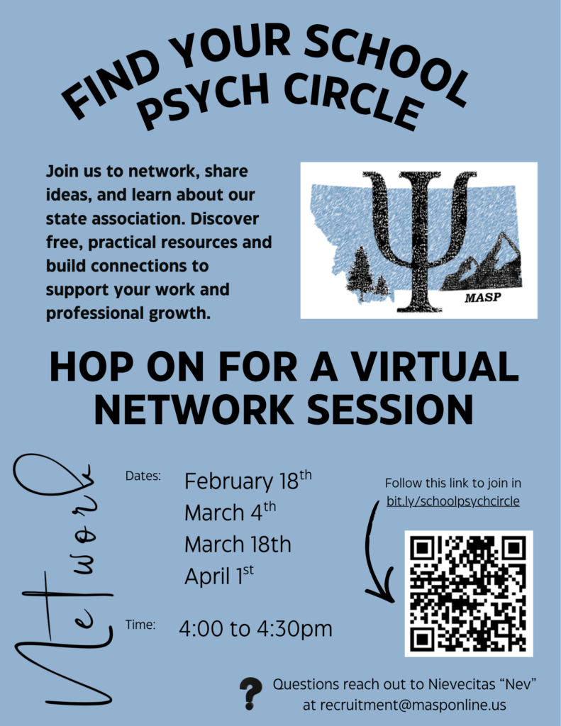 If you are a school psychologist in Montana and are interested in networking with some other amazing school psychologists in the state, join us for our first School Psych Circle online networking event! This online event is free to any school psychologist whether you are a MASP member or not! Come chat, network, and exchange resources with us!